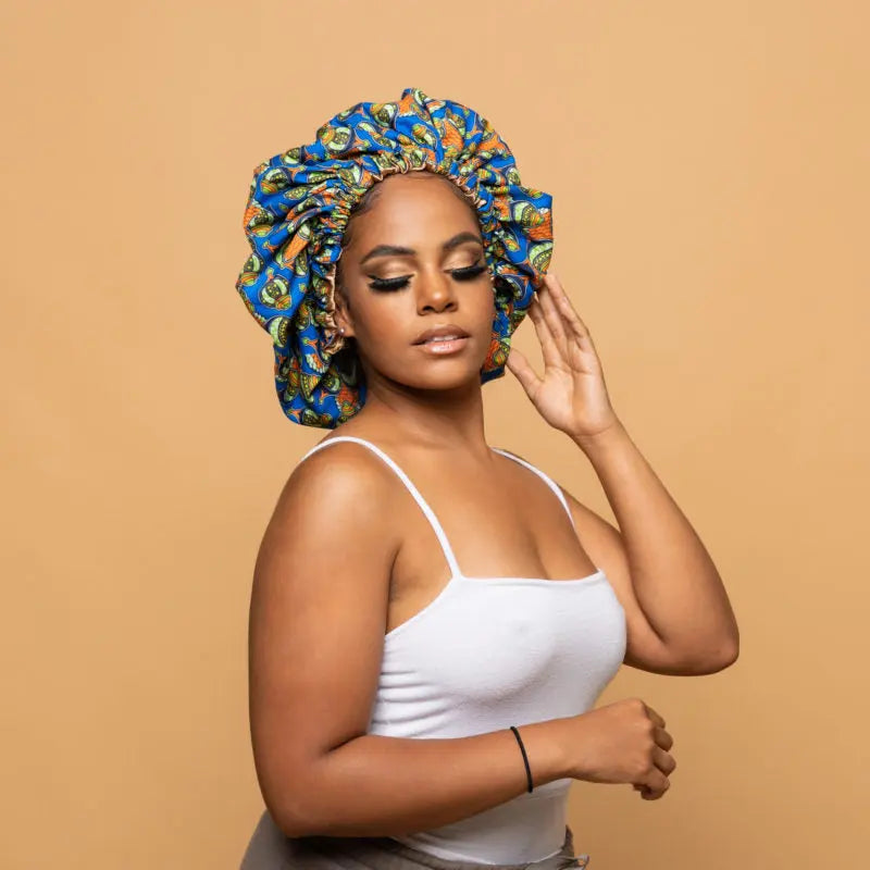 Le bonnet imprimé wax avec son intérieur en satin est l’accessoire indispensable qui permet de conserver l’hydratation de vos cheveux, les protéger tout au long de la nuit. Il s’adapte facilement à la forme de la tête grâce à son élastique.