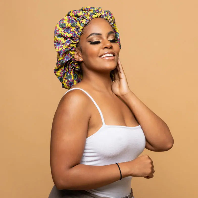 Le bonnet imprimé wax avec son intérieur en satin est l’accessoire indispensable qui permet de conserver l’hydratation de vos cheveux, les protéger tout au long de la nuit. Il s’adapte facilement à la forme de la tête grâce à son élastique.