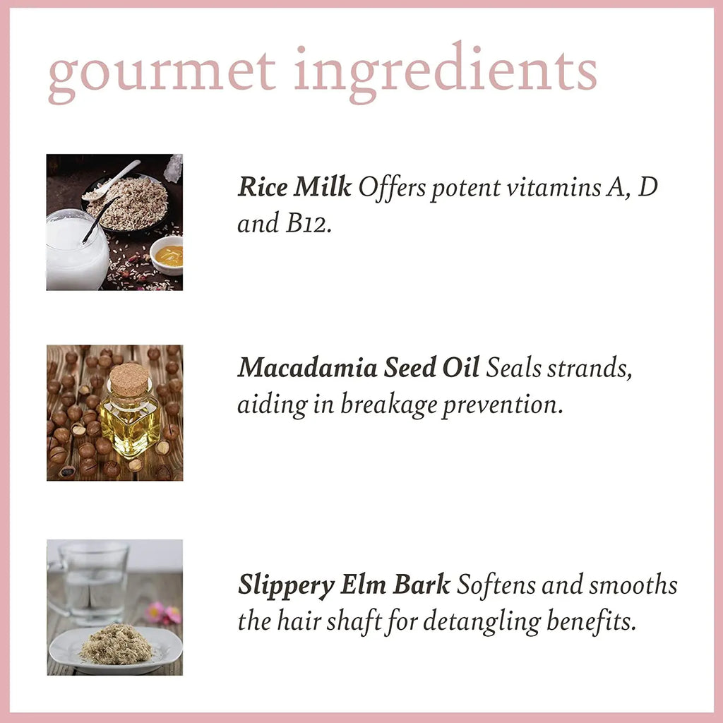 Deionized Water, Behentrimonium Methosulfate (BTMS), Cetearyl Alcohol, Persea Gratissima (Avocat) Oil, Oryza Sativa (Riz) Bran Oil, Aloe Barbadensis Leaf Juice, Ricinus Communis (Ricin) Seed Oil, Macadamia Ternifolia (Macadamia) Seed Oil, Sorbitol, Camellia Sinensis (Thé vert) Leaf Extract, Oryza Sativa (Riz) Milk, Rosa Canina (Rose musquée du Chili) Fruit Oil, Ceteareth-20, UlmusFulva (Orme rouge) Bark Extract, Phenoxyethanol (OptiphenND), Caprylyl Glycol, Parfum sans phtalates Phthalate, et de l'amour!