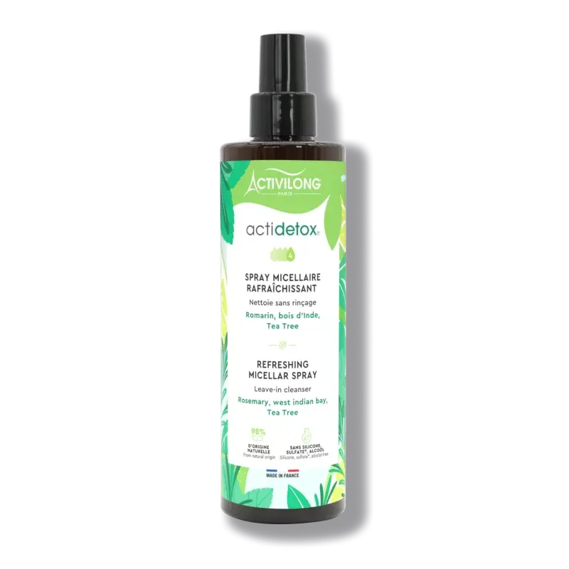 Le Spray Micellaire Rafraîchissant ACTIDETOX de la marque ACTIVILONG remplace le shampoing sec.