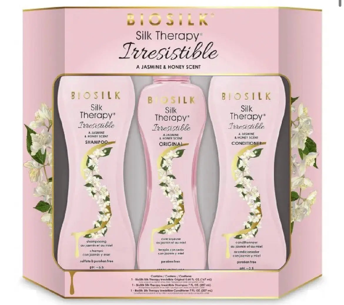 Composition : 1 biosilk silk therapy irresistible original 5.64 fl. oz.1 biosilk silk therapy shampooing irrésistible 7 fl. oz.1 biosilk silk therapy revitalisant irrésistible 7 fl. oz.