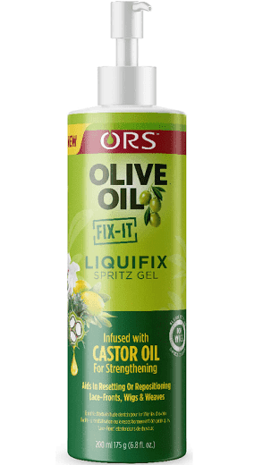 Réajustez les perruques, les tissages et les fronts en dentelle en un instant avec le gel FIX IT Liquifix Spritz à l'Huile l'Olive Infusé d'huile de rincin d'ORS. Ce gel ultra résistant sèche pour donner une finition collante, vous permettant de repositionner les perruques pour un résultat indétectable. Sa formule renferme un complexe de kératine plus puissant que le panthénol, qui améliore la force des cheveux tout en améliorant leur résistance au coiffage. L'huile de ricin traite les cheveux et le cuir chevelu, en contribuant ainsi à préserver la santé des cheveux et du cuir chevelu lors du port de perruques ou de fronts en dentelle. Le gel s'applique à l'aide d'un flacon pulvérisateur facile à utiliser et sèche sans laisser de résidus.