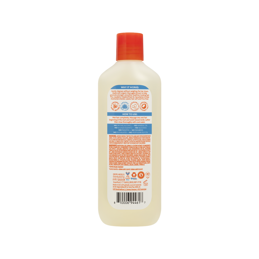 WATER (AQUA, EAU), SODIUM C14-16 OLEFIN SULFONATE, COCAMIDOPROPYL BETAINE, COCAMIDE DIPA, COCAMIDOPROPYL HYDROXYSULTAINE, GLYCERIN, AGAVE TEQUILANA LEAF EXTRACT*, SQUALANE, LIMNANTHES ALBA (MEADOWFOAM) SEED OIL, MACADAMIA TERNIFOLIA SEED OIL, BUTYROSPERMUM PARKII (SHEA) BUTTER*, COCOS NUCIFERA (COCONUT) OIL*, LINUM USITATISSIMUM (LINSEED/FLAXSEED) SEED OIL*, SERENOA SERRULATA (SAW PALMETTO) FRUIT EXTRACT, CAMELLIA SINENSIS (GREEN TEA) LEAF EXTRACT, HYALURONIC ACID, ALOE BARBADENSIS (ALOE) LEAF JUICE (DECOLORIZED), ARGANIA SPINOSA KERNEL OIL, ORYZA SATIVA (RICE) BRAN OIL, SIMMONDSIA CHINENSIS (JOJOBA) SEED OIL, TOCOPHEROL (VITAMIN E), MENTHA SPICATA LEAF/STEM OIL, GLYCINE SOJA (SOYBEAN) OIL, POLYQUATERNIUM-7, POLYQUATERNIUM-10, ETHYLHEXYLGLYCERIN, POTASSIUM SORBATE, SODIUM BENZOATE, TRISODIUM ETHYLENEDIAMINE DISUCCINATE, HYDROLYZED SOY PROTEIN, FRAGRANCE (PARFUM), SODIUM CHLORIDE, SODIUM ASCORBYL PHOSPHATE, CITRIC ACID, PHENOXYETHANOL, BENZYL ALCOHOL, SODIUM SULFITE, HEXYL CINNAMAL, LINALOOL, GERANIOL, CITRONELLOL. *Organic